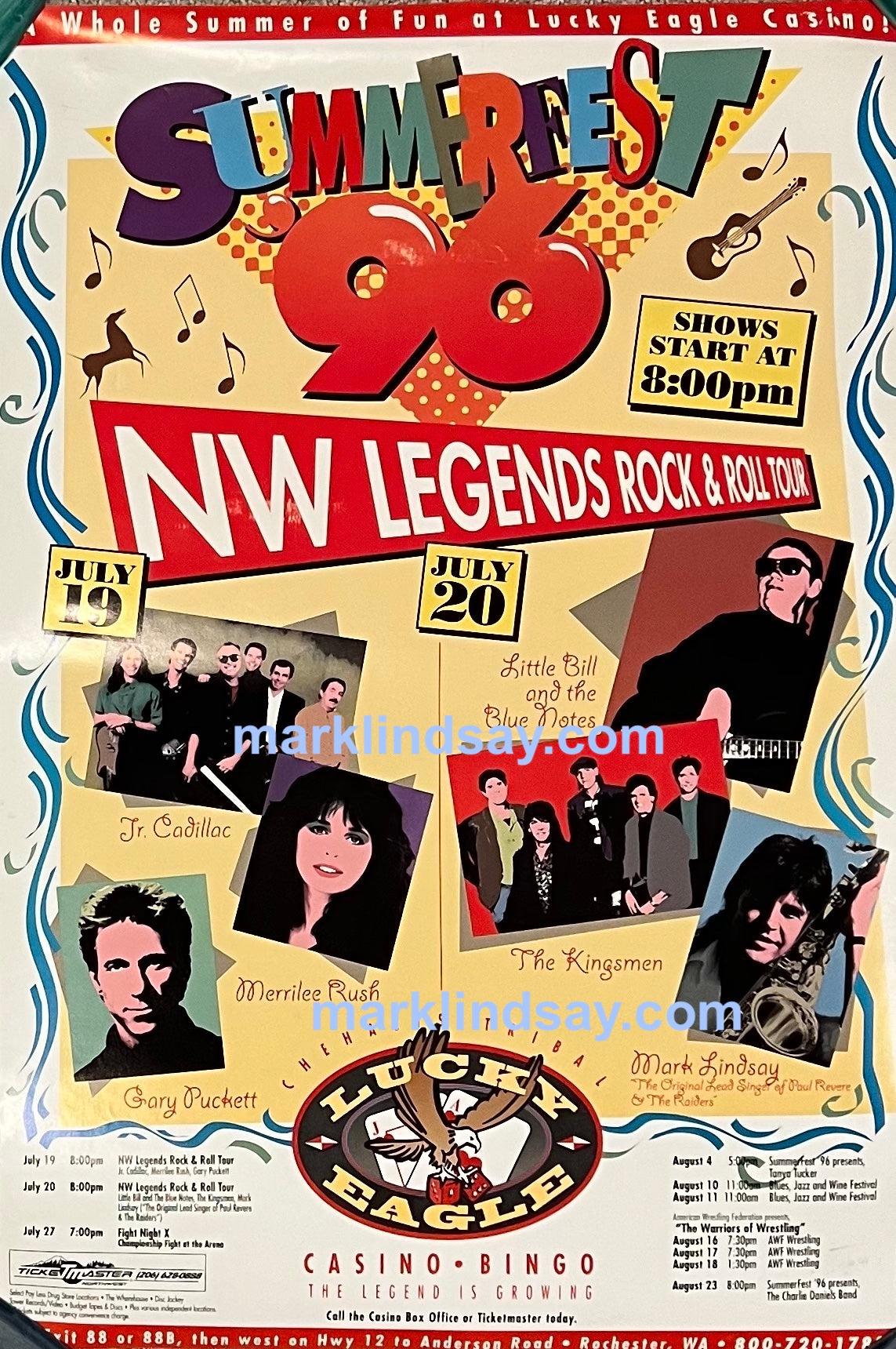 This is a vintage 16"x24" poster for Summerfest '96, which featured NW Legends of Rock & Roll, who performed on July 19 and 20th, 1996 at the Lucky Eagle Casino near Seattle. Mark Lindsay, The Kingsmen, and Merrilee Rush were some of the NW icons who performed. Despite being 27 years old, the poster is in excellent condition.