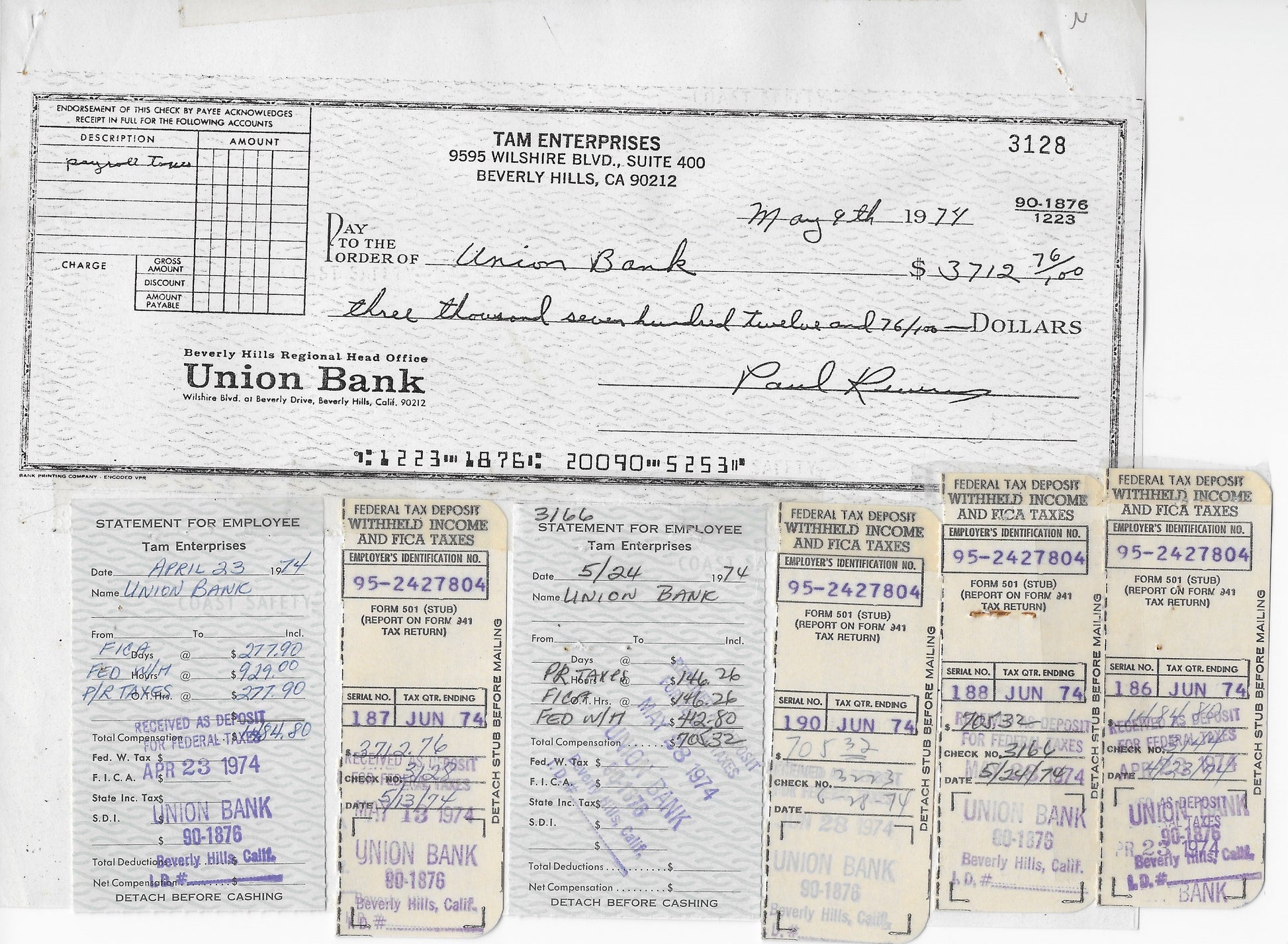 This is the a file copy of a TAM Enterprises 1974 check signed by Paul Revere (the 1974 copy, not a contemporary copy), with 6 attached original stubs reflecting payroll taxes that the Raiders production company paid. The entire piece measures 7" x 9-3/8".
