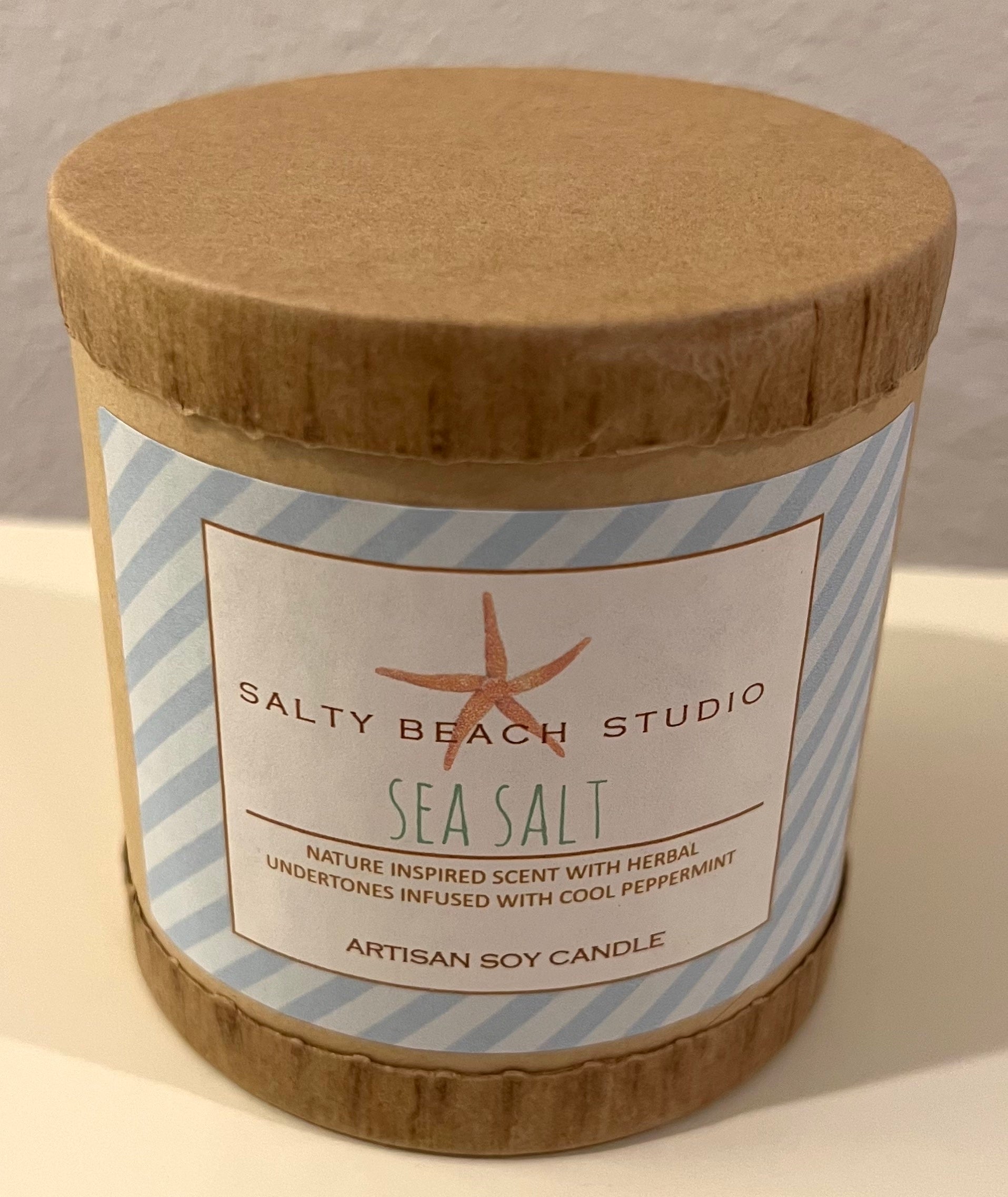 This is a Salty Beach Studio "Sea Salt" long-burning soy candle in a glass container, hand-poured by a woman artisan on the coast of Maine. Measures 3" in diameter and 4" tall, and comes packaged in a round kraft gift container.