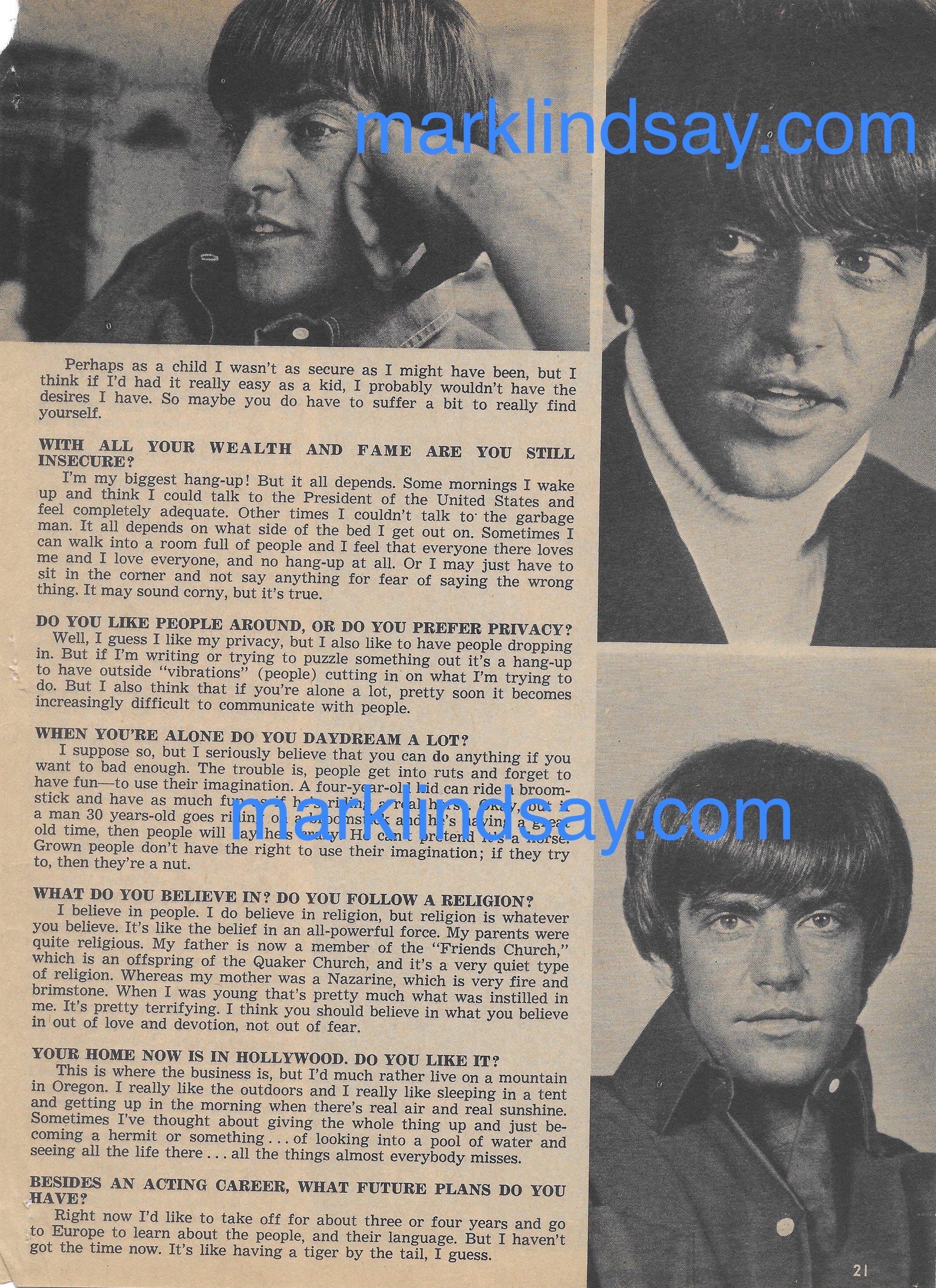 This is an original article featuring Mark Lindsay from an unknown teen magazine, circa 1968. Measures 8" wide and 10-3/4" high.