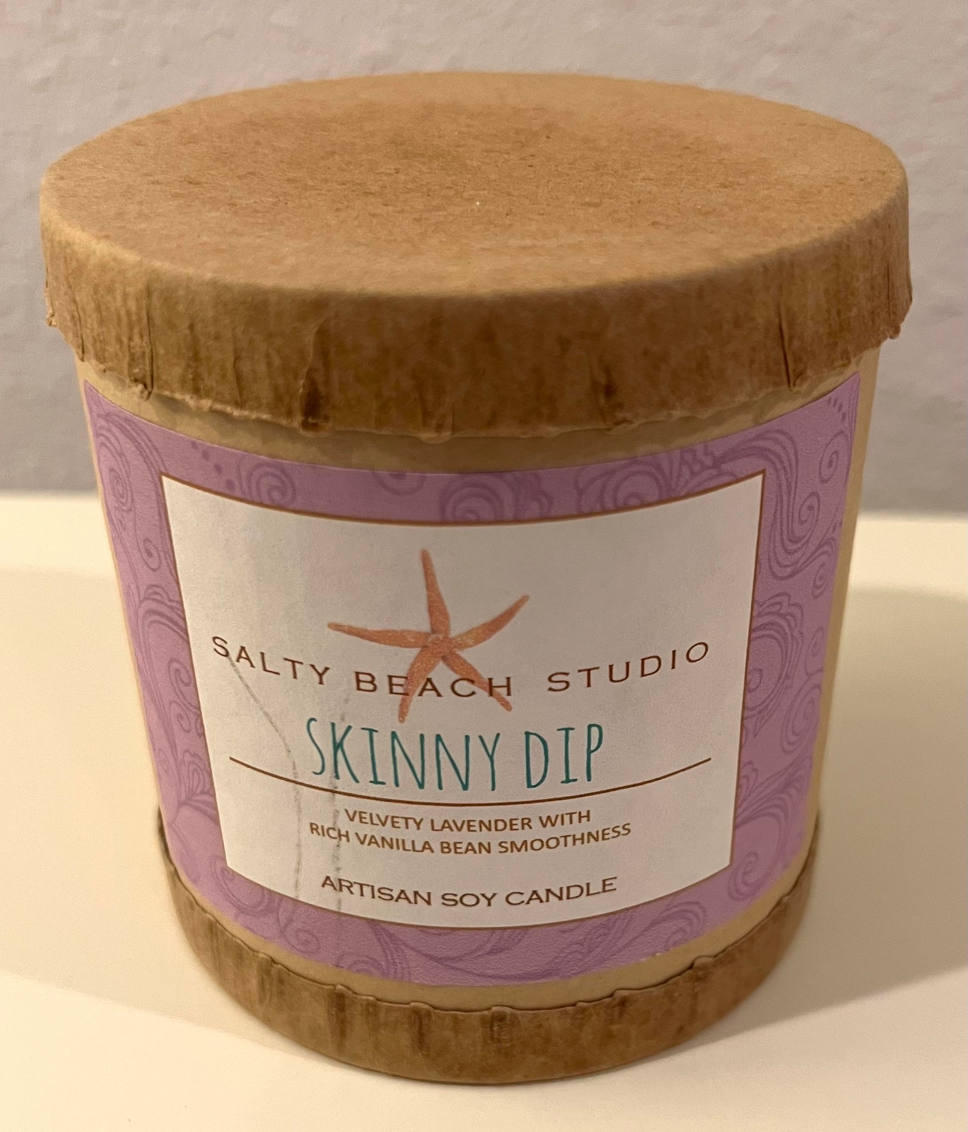 LAST ONE! This is a Salty Beach Studio "Skinny Dip" long-burning soy candle in a glass container, hand-poured by a woman artisan on the coast of Maine. Measures 3" in diameter and 4" tall, and comes packaged in a round kraft gift container.