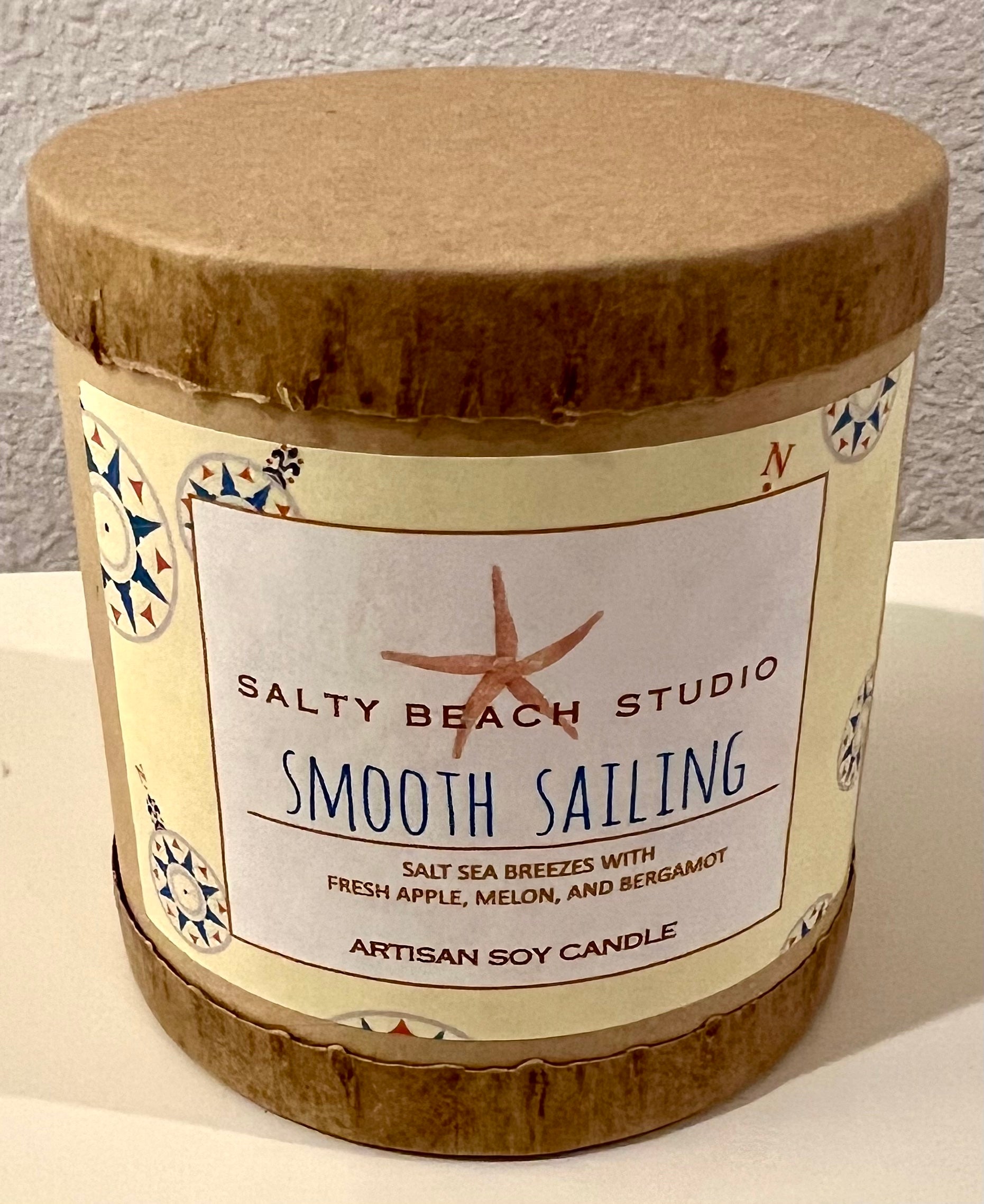 This is a Salty Beach Studio "Smooth Sailing" long-burning soy candle in a glass container, hand-poured by a woman artisan on the coast of Maine. Measures 3" in diameter and 4" tall, and comes packaged in a round kraft gift container.