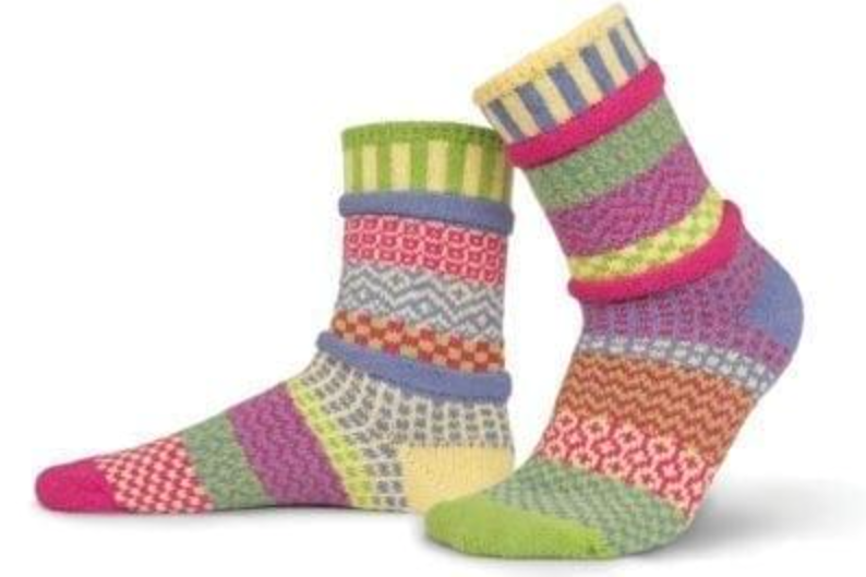 These are colorful, mis-matched unisex socks which are made in the USA by a woman-owned business, from 62% recycled cotton, 22% polyester, 15% nylon, 1% lycra. Machine washable. If sizing is perfect for you the first time you wear them, air dry. If you'd like them a little smaller, machine dry. Fun for your feet!