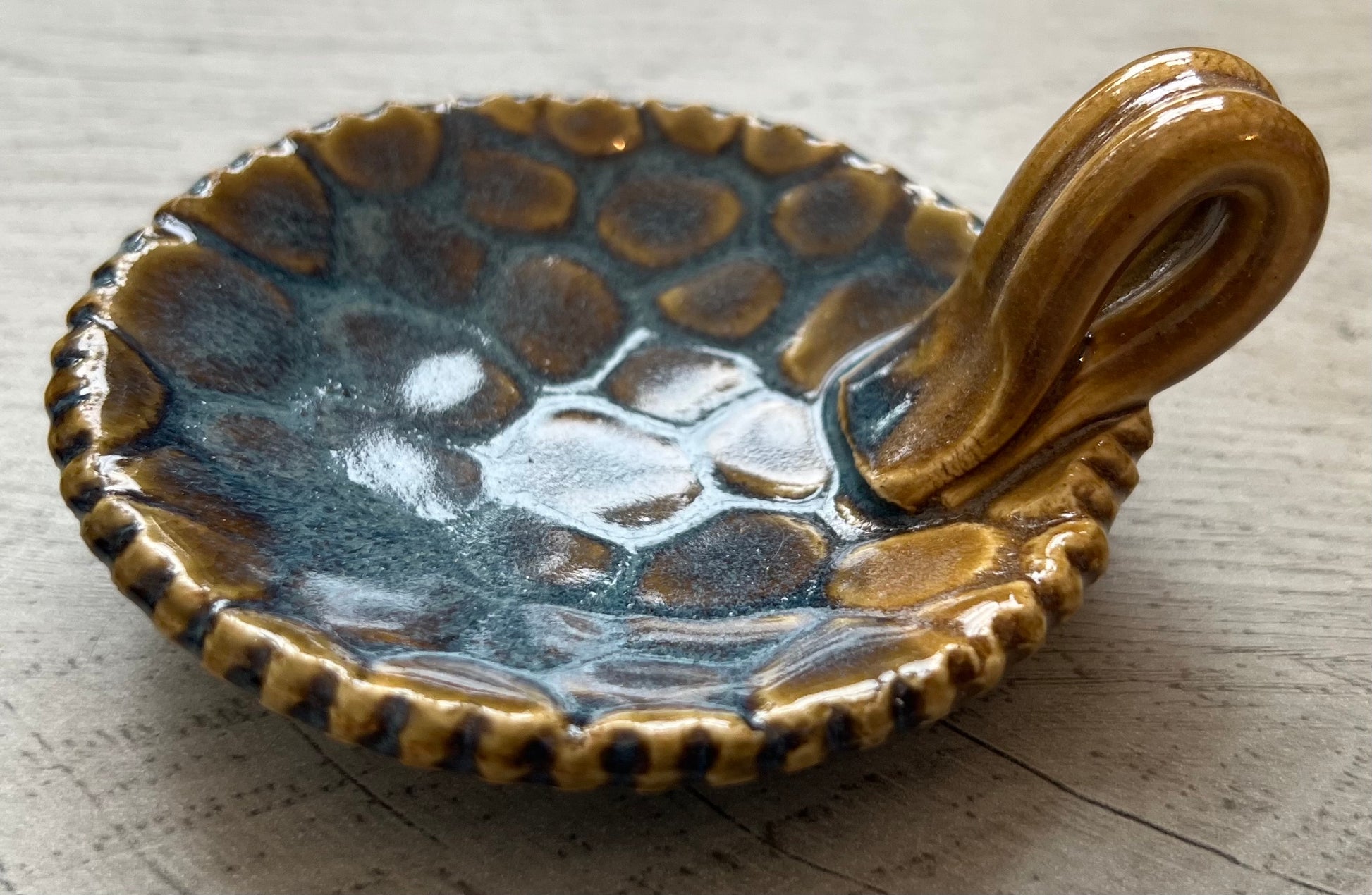 It comes with a one of a kind artisan-crafted pottery piece (measuring approximately 3" in diameter and 2" high) from our shop in Maine, which can be used as a teabag holder, a mug topper to keep a drink warm, a spoon rest, a ring holder, a place to put your vitamins, a votive candle holder, or use your imagination! (Please note that any white spots on the pottery photos are reflections.) All pieces are food safe and can be put in the dishwasher. They are completely glazed on the top and partially glazed on the bottom and have a curved shape.