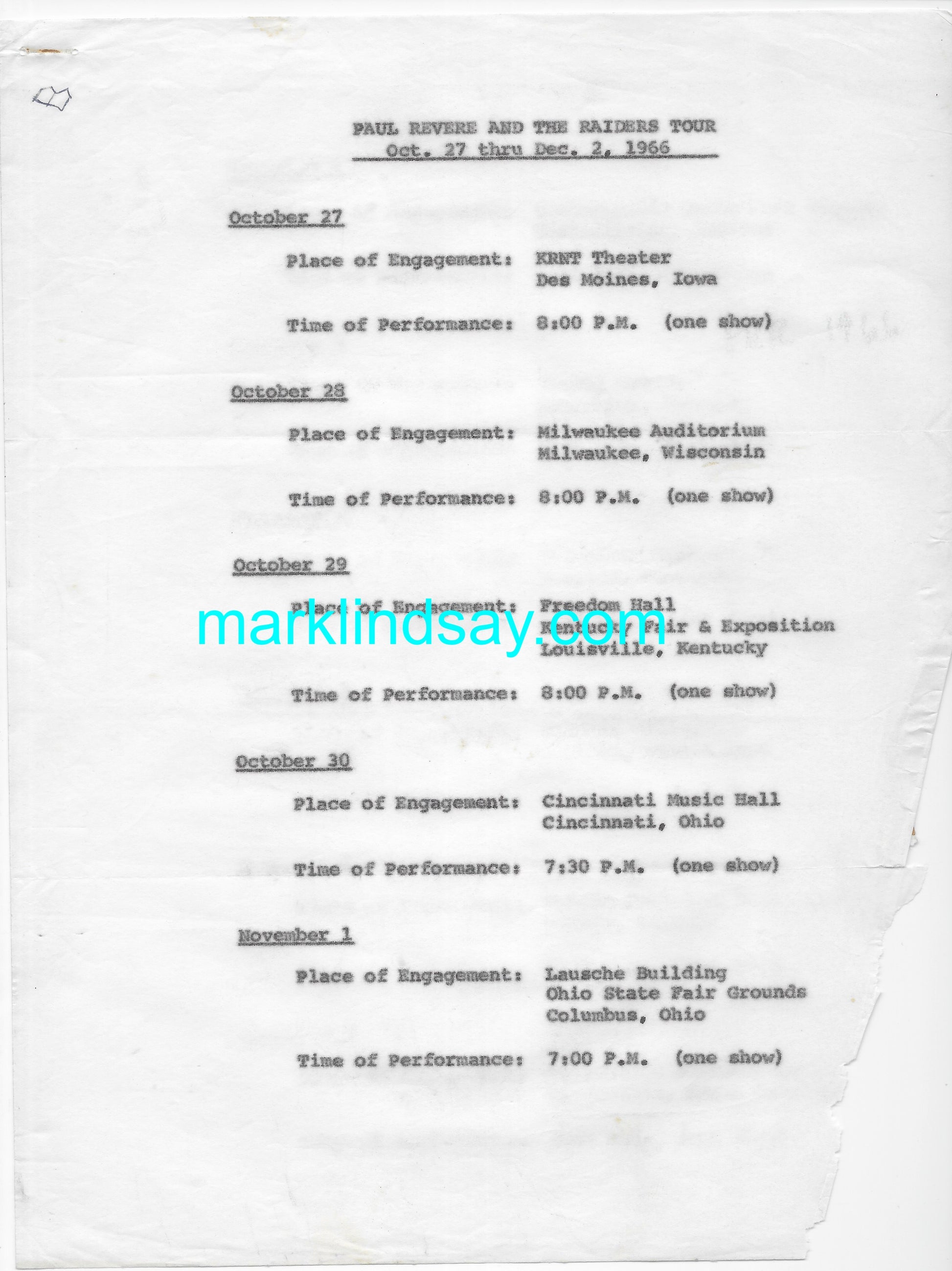 Mark will PERSONALLY AUTOGRAPH the last page to the name of your choice with the nomenclature "original 1966 Tour Schedule" in blue ink. (Note: the "marklindsay.com" watermarks do not appear on the autographed piece.)